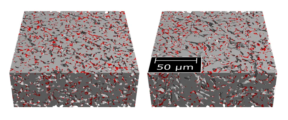 In der Abb. 1 ist der Digitale Zwilling (links) neben dem Original, dem segmentierten nanoCT Scan einer Graphit Anode, gezeigt. Porosität, Binderanteil, Tortuosität, Diffusivität, Porengrößenverteilung sowie Partikelgrößenverteilung stimmen innerhalb statistischer Abweichungen überein.