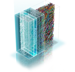 Anhand von mit GeoDict modellierten Vliesstoffen wird ein neuronales Netzwerk an künstlichen 3-D Bildern trainiert, für die die Verteilung des Binders bekannt ist. Nach dem Training erkennt das neuronale Netzwerk dann auch den Binder in den 3-D Bildern realer Vliesstoffe, die mit µCT oder FIB-SEM aufgenommen wurden. Das Ergebnis sind hochpräzise Simulationen und Analysen der produktionsbedingten Binderverteilung im Vliesstoff.