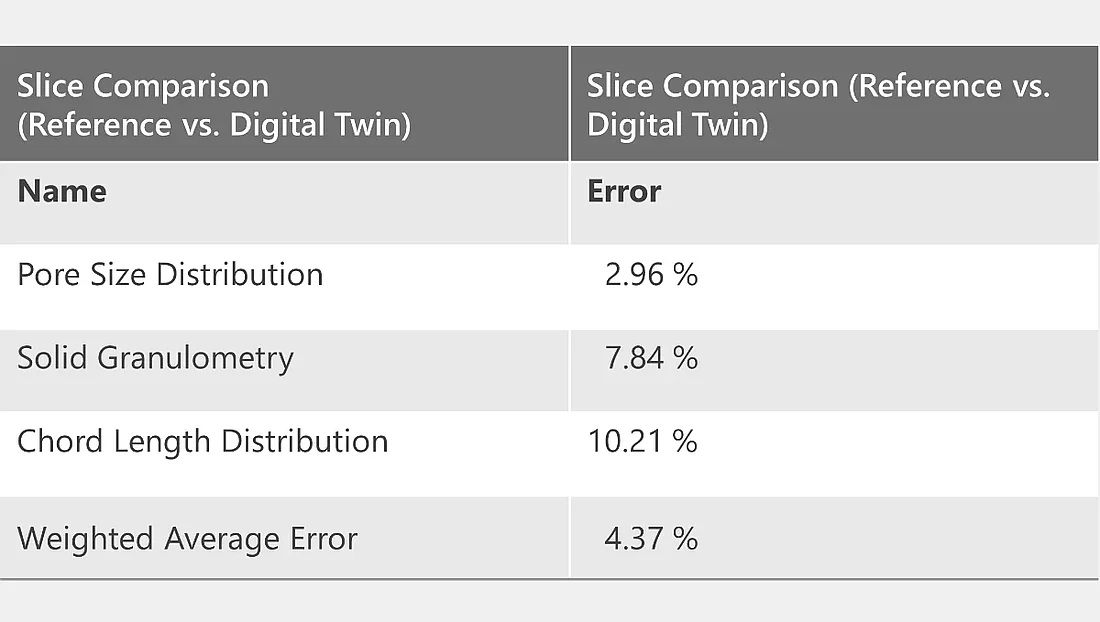 Für die Referenzgeometrie aus dem µCT-Scan ergibt sich ein Wert von 57.29 %, für den digitalen Zwilling 52.35 %. Die Abweichung von etwa 9 % bestätigt die hohe strukturelle Übereinstimmung und demonstriert die Fähigkeit, präzise 3D digitale Zwillinge auf Basis von 2D-Bilddaten zu erzeugen.