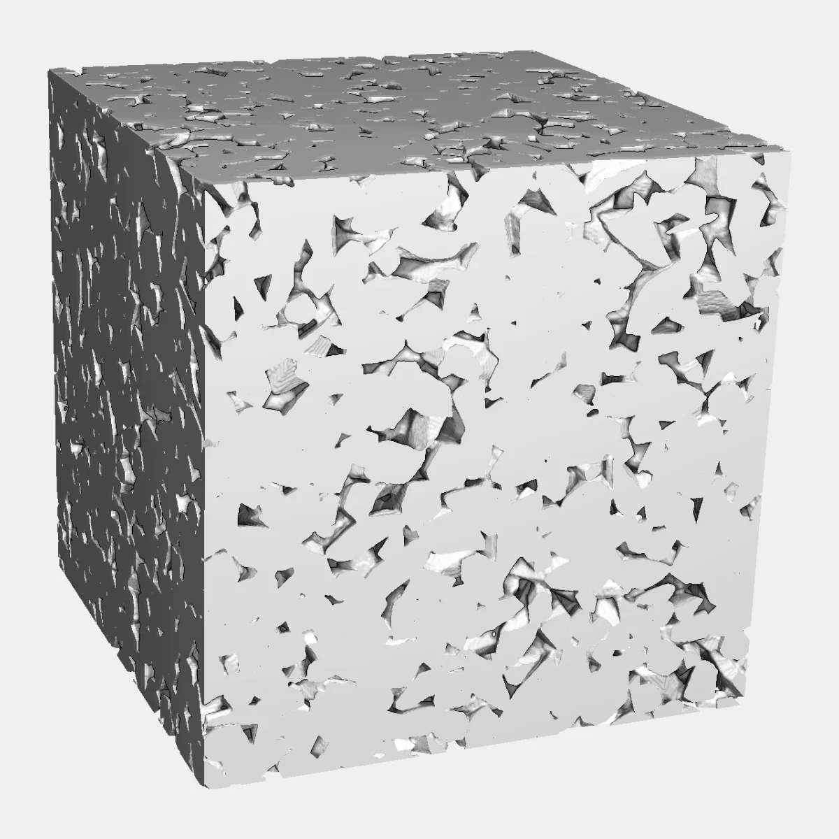 In diesem Fall ist die vollständige 3D-Geometrie durch einen hochauflösenden µCT-Scan bekannt. Für die Erzeugung des digitalen Zwillings wurde jedoch lediglich eine einzelne 2D-Schnittaufnahme (Abb. 1) verwendet. Auf Grundlage dieser Aufnahme wird ein 3D-Mikrostrukturmodell automatisch so optimiert, dass Porengrößenverteilung, Partikelgrößenverteilung der Festphase, die spezifische Oberfläche sowie die Sehnenlängenverteilung übereinstimmen.