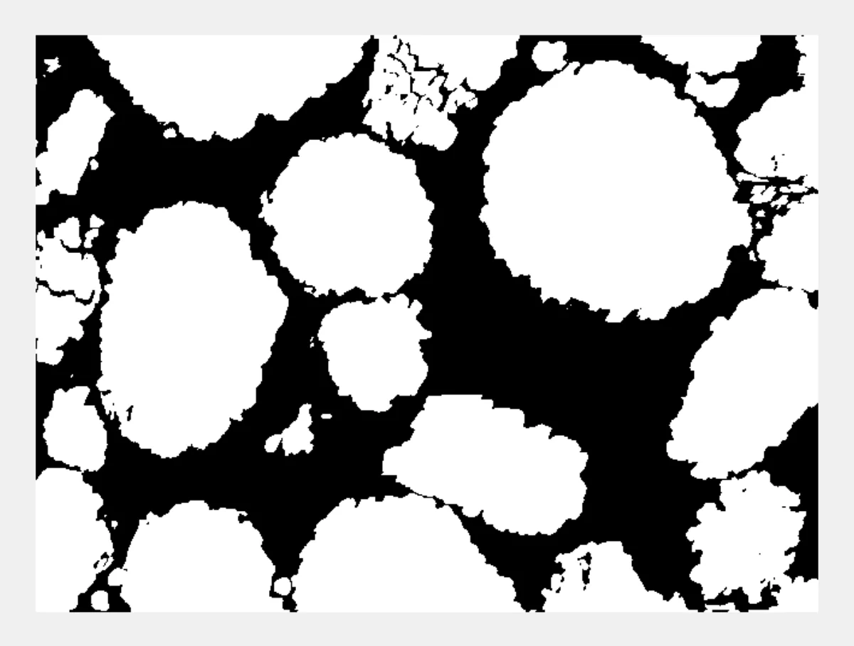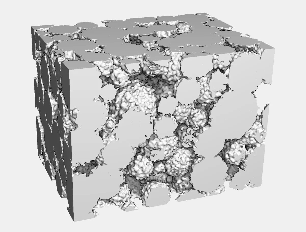 In diesem Fall ist die vollständige 3D-Geometrie durch einen hochauflösenden FIB-SEM-Scan bekannt. Für die Erzeugung des digitalen Zwillings wurde jedoch lediglich eine einzelne 2D-Schnittaufnahme (Abb. 1) verwendet. Auf Grundlage dieser Aufnahme wird ein 3D-Mikrostrukturmodell automatisch so optimiert, dass Porengrößenverteilung, Partikelgrößenverteilung der Festphase sowie die spezifische Oberfläche übereinstimmen.