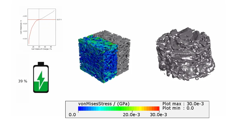 During cycling, volumetric changes of the active material induce stresses on the micro- and macro-scale, leading to cracks and delamination, and deformation of the inactive layers and the casing [1]. The altered microstructure is said to “age” and it suffers from capacity loss and damaging effects like lithium-plating [2]. The quantitative simulation of this battery aging on a microstructural level is now jointly pursued by Math2Market and the MaDE group of Prof. Vanessa Wood (ETH Zürich) in the framework of the EU-project “SOLVED!”.