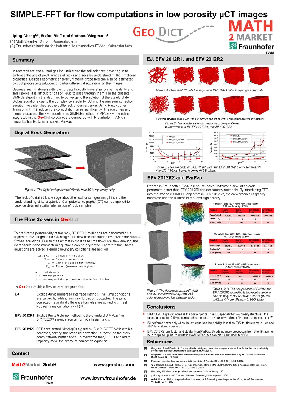 Because such materials with low porosity typically have also low permeability and small pores, it is difficult for gas or liquid to pass through them. For the classical SIMPLE algorithm it is also hard to converge to the solution of the steady state Stokes equations due to the complex connectivity. Solving the pressure correction equation was identified as the bottleneck of convergence. Using the Fast Fourier Transform (FFT) reduces the computation times significantly. The runtime and memory usage of the FFT accelerated SIMPLE method, SIMPLE-FFT, which is integrated in the GeoDict software, are compared with Fraunhofer ITWM’s inhouse Lattice Boltzmann solver, ParPac.