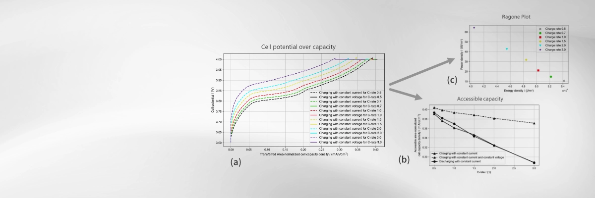 The GeoApp helps you to visualize the charge rate dependent transferred capacities for the charging and discharging step. It also shows you the cell profile over time and the Ragone plot containing the power density and energy density of your battery for each tested charge rate.