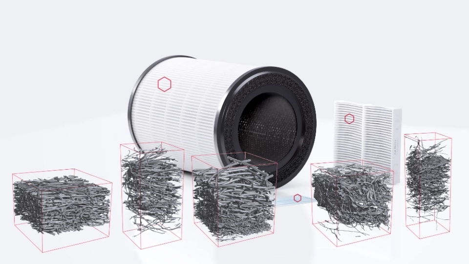 In the case study shown here, the microstructure of a two-layer filter medium of an existing face mask is analyzed. The microstructure is the result of importing and segmenting µCT scans of the filter medium in GeoDict. The scan resolution is 400 nm.