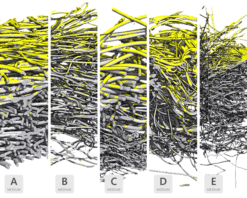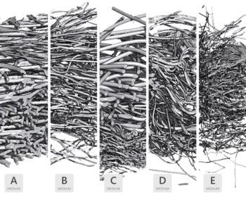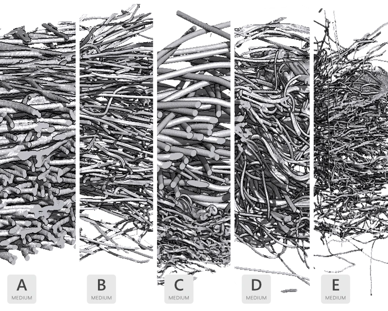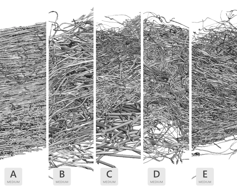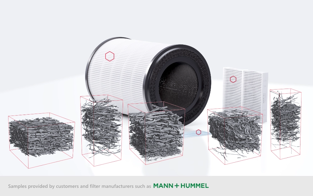 GeoDict converts 3D images of real filters, obtained via micro-CT or FIB-SEM analyses, into digital materials. Consequently, the real filter structure provides the basis for all subsequent filtration analyses and simulations. Different samples, each with unique shapes and morphologies are tested for simulation (filter media A–E).