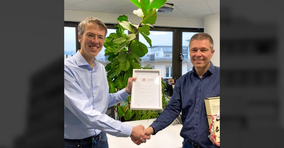 In his role as COO, and as newly designated authorized signatory (Prokurist in German), Jürgen Becker presents Andreas Wiegmann with a certificate for his 10 years as the CEO of Math2Market GmbH. In these years, he has gone above and beyond his duties to push the company forward and establish the GeoDict software as the fundamental and indispensable simulation software that it is today. Die Mitarbeiter der Math2Market gratulieren herzlich zum Jubiläum und bedanken sich für seinen wertvollen Dienst.