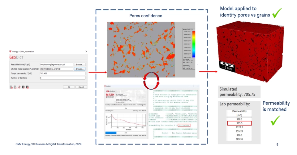 A joint project was initiated between OMV and Math2Market to investigate the possibility for automating and standardizing the segmentation of CT scans to digital rock structures. The project was split into two tranches – part one to prove the concept of iterating only with grain and pore space to match a measured routine core analysis permeability. Part two was to extend this to multi-mineral segmentation, again iterating to match a target measured permeability.