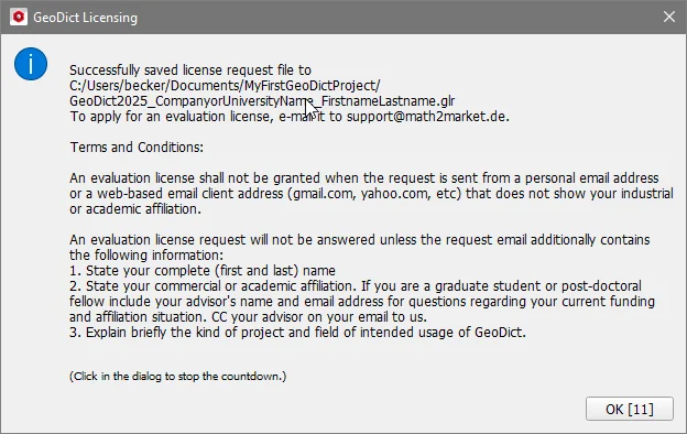 2. This generates a .glr (GeoDict license request) file that is saved in the default location (/Documents/MyFirstGeoDictProject) or in a specified location.