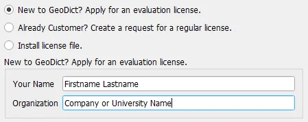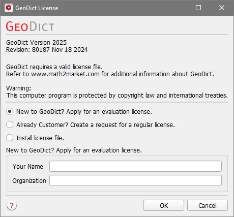 1. Check "New to GeoDict? Apply for an evaluation license. Type Your Name and the name of your Organization (Company, University, Institute, etc.), and then click OK.