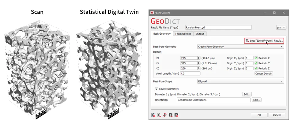 - In GeoDict 2023, the result from PoroDict’s Identify Pores is directly loaded into FoamGeo with the click of a button to generate a Digital Twin. Up to GeoDict 2022, building a digital twin of a foam imported from a µCT meant manual work and transferring values from one module to the others. The new development in GeoDict 2023 makes the workflow a lot more intuitive and streamlined.