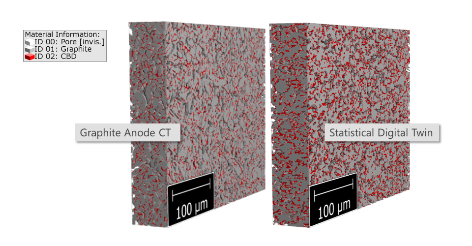 One starts with an image stack of a cathode material and performs some image processing to enhance the image quality. Next, one segments the material phases and reconstruct the 3D-structure. After that, one calculates statistical properties, like open and closed porosity, tortuosity, or diffusivity, of this imported material. For the creation of the statistical digital twin, one starts with particles with a given shape and size distribution. One specifies the volume fraction of these particles and adapts the shape of the particles. Finally, one adds binder and carbon black with a given contact angle to the structure.