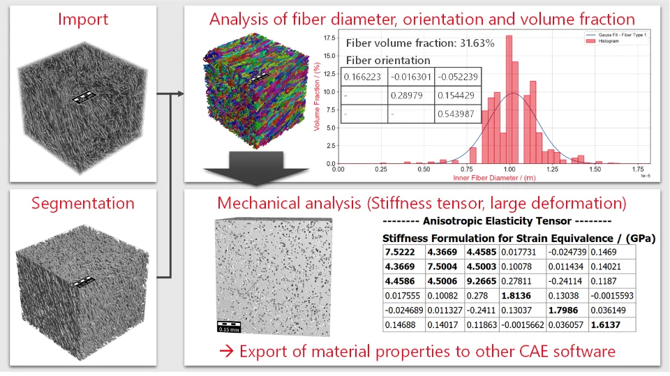 In the first part, we delve into the analysis of a glass fiber-reinforced polypropylene specimen produced by the Leibniz-Institut für Verbundwerkstoffe GmbH (IVW). This material boasts a fiber volume content of 13%, a tensile modulus of 6 GPa, and an elongation at break of 2.5%. GeoDict plays a pivotal role in this study, offering a comprehensive toolkit for material analysis. The key steps involved segmentation, fiber analysis, pore identification, and mechanical property analysis, all conducted seamlessly within GeoDict.