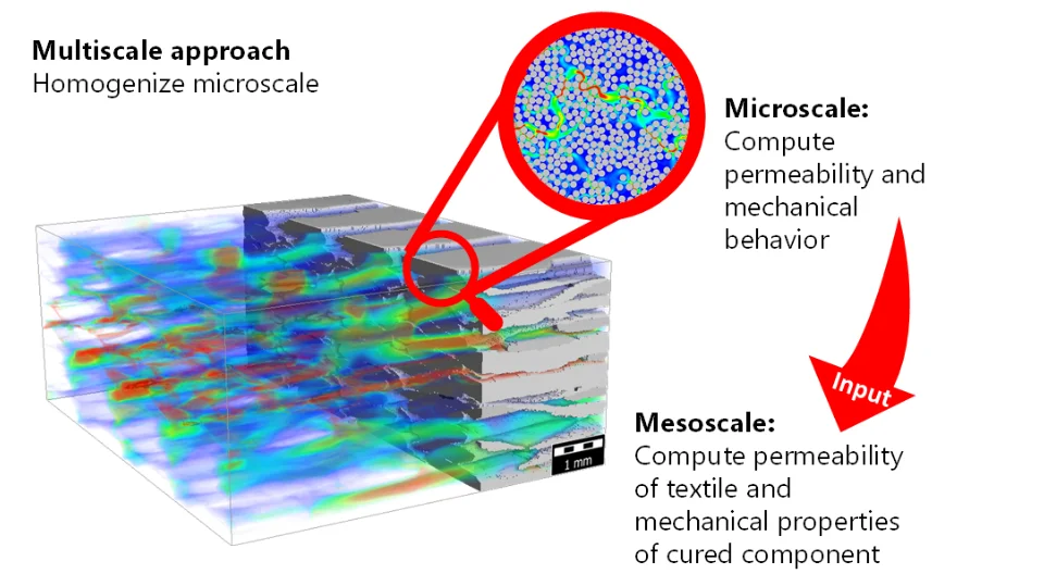 In the second part, we shift our focus to the efficient determination of permeability in glass fiber textiles, exemplified by a unidirectional glass fiber fabric (Hacotech G300U 1270). GeoDict introduces a groundbreaking workflow that minimizes the extensive experimental tests typically required for permeability determination. This innovative approach begins with micro-scale modeling, where individual fibers, each with a diameter of a few micrometers, are represented in a three-dimensional model. Subsequently, mesoscale modeling of the fabric with solid rovings follows, aided by GeoDict's versatile capabilities.