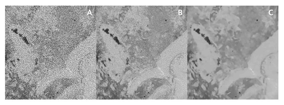 This method was applied to heterogeneous carbonate samples representative of rock formations that host the prolific super giant hydrocarbon reservoirs in the Middle-East. Core plugs were carefully selected to represent the key rock types and pore-scale heterogeneities that are typically observed in the subsurface carbonate reservoirs in this region. We obtained registered image pairs of these plugs using a micro-CT scanner at two different exposure times that resulted in extremely low (Figure 1A) and high (Figure 1B) image quality.  We then used the GeoDict software package for Digital Core Analysis to train the CNN model to transform low-quality to high-quality images.