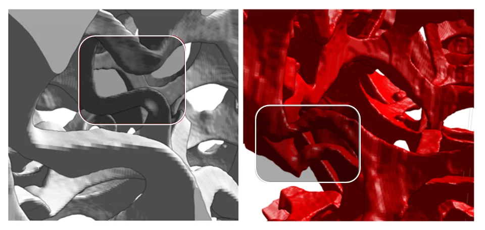 The simulation of the compression of 35% is possible thanks to the voxel-based FFT solver FeelMath [2] in the GeoDict simulation software. By comparing simulation and scan, the simulation can be validated in two ways: First, the load curves show whether the stresses in the foam are similar in simulation and experiment. Second, the different deformation modes observed in the simulation are compared to the deformation modes in the scan, as well as the evolution of pore shapes with increasing compression.