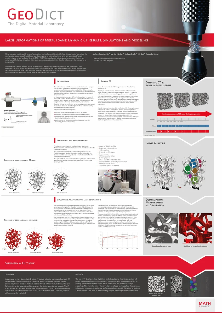 Metal foams are used in a wide range of applications, such as lightweight materials. As an integral part of a structure, the mechanical characteristics of metal foams and their response to external load need to be well understood. To gain greater insights, we use lab-based dynamic CT (by TESCAN) to visualize the uninterrupted compression of aluminum metal foams. Mechanical simulations of the same samples, carried out with the GeoDict software, are then compared to those results.