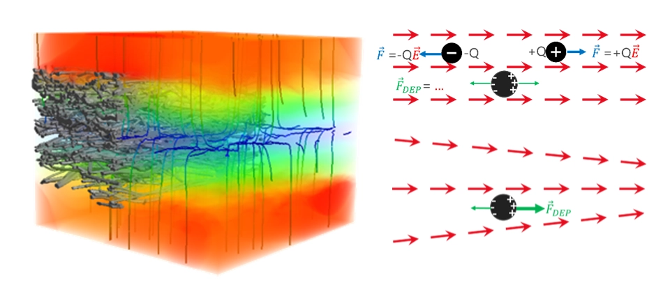 Bottom right: Red arrows indicate a non-uniform electric field. Uncharged particles are affected by the dielectrophoretic effect. But in this case, the forces FDEP do not balance out and even originally uncharged particles are affected by a non-uniform electric field.