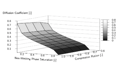 In the current work, we present a comprehensive modeling framework to predict the effective gas diffusivity, as a function of liquid water saturation, based on realistic 3-D microstructures of the uncompressed as well as compressed gas diffusion layer (GDL). The presented approach combines the generation of a virtual microscopic GDL and different physical modeling. We develop a reduced model in order to simulate the compression of the GDL layer since its compression has a strong impact on the material properties such as the water transport or its gas diffusion. Then, we determine the two-phase distribution of a non-wetting fluid, i.e. water, and a wetting fluid, i.e. air, within the GDL for different saturations. This is done using a full morphology (FM) model. Finally, solving the Laplace equation for the partly saturated medium we determine the relative gas diffusion, i.e. the gas diffusion depending on the saturation. In the present work, our approach is applied to a typical GDL medium, a SGL10BA carbon paper.